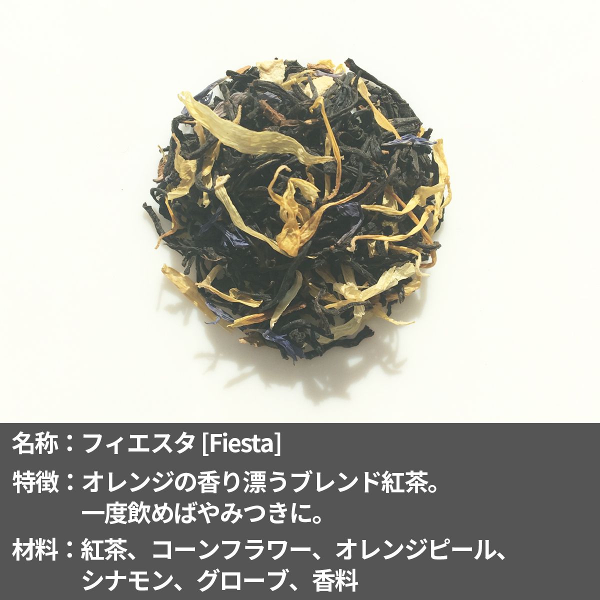 | 原材料 | 紅茶、コーンフラワー、オレンジピール、シナモン、グローブ、香料 |