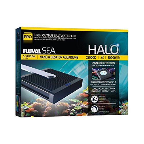 Studio : Hagen Publisher : Hagen Binding : Misc. Product Description Engineered in Germany, and featuring new compact LED technology, the Fluval Sea Halo High Output Saltwater Nano LED Light is designed to support and grow healthy and vibrant corals in marine reef nano tank environments. Total LED Count : 42. Watts: 22 W. Lumens: 1050 lm. Color Temp: 25000K. The light attaches to the back of the tank with an adhesive backing. Can be used on both rimless and aquariums with top frames (max frame height: 30mm / 1-1/8"). 0