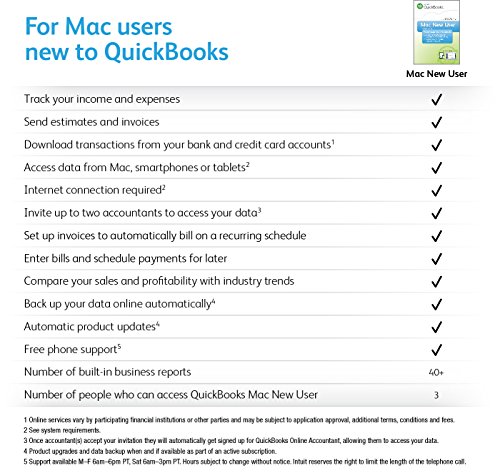 Get all QuickBooks Online Essentials Small Business Accounting features, plus… QuickBooks Mac New User Small Business Accounting is an easy and intuitive way to run your business on your Mac and on the go from any mobile device. It is easy to set up and is personalized for your business. Track income, expenses, and profit information all in one place. Get paid fast by sending online invoices. Save time and reduce data entry errors by automatically downloading your bank and credit card transactions. Access 20+ insightful reports to understand the health of your business. Expand your QuickBooks functionality by easily syncing with 350+ apps. 60 day money back guarantee.Feature