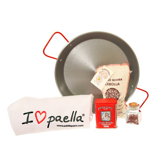 -. Feature : Authentic paella pan. Made in Spain. / Carbon steel is durable and conducts heat well. Requires a bit of maintenance after washing. / Safe for stovetop, oven, or grill. / Wonderful gift set for someone special. Serves Two. / Comes with an informative pamphlet that contains two recipes, tips for perfect paella, and care instructions.