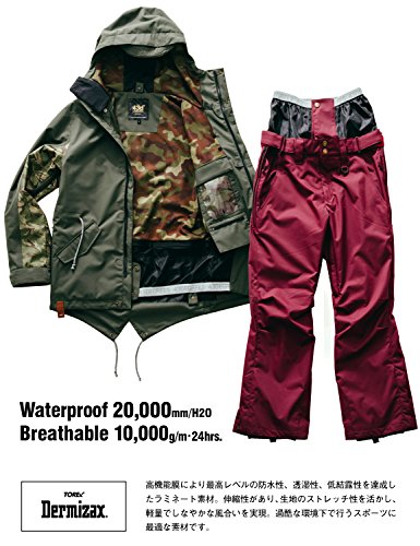 촉감이 좋은 침투 방수 원단은 안심 일본제.게다가20,000mm의 내수 가공.비나 눈을 여유에 연주고 있습니다.땀을 방출하는 투습성은 10,000g의 고스펙 소재.비가 내려도 수적(물방울)가 구슬과 같이 굴러 빠짐,웨어내가 찌를 큰폭으로 경감.어떤 악천후하의 라이딩으로도 견딜 수 있는 스노보드 웨어입니다.