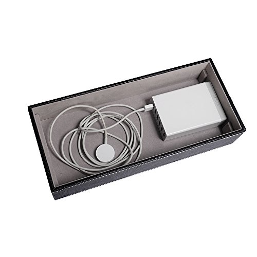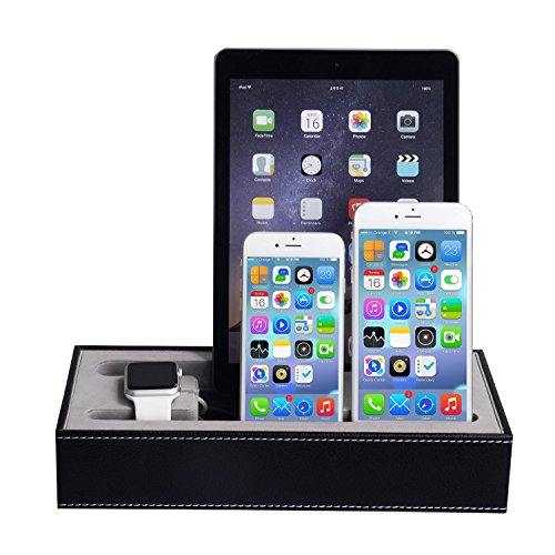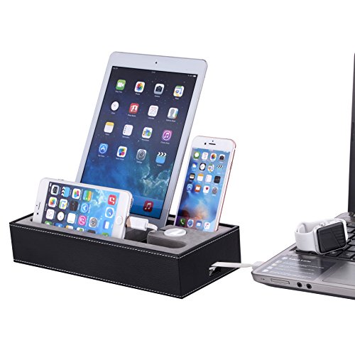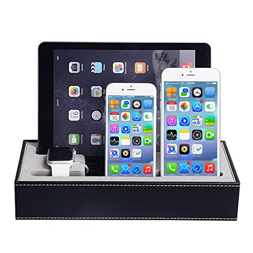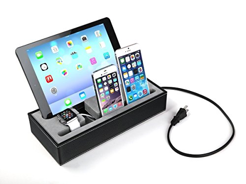 ✔One Super multi Device Charging station which can accommodate multi-port USB (not include)inside,you get 2 smartphone stand holders, 1 ipad stand holder,1 apple watch stand holder !! USB CHARGER AND CABLE NOT INCLUDE !!! ✔All in one docking station for your iPod, iPhone, iPad & Apple Watch (Only One Special Cutout for Apple Watch Charger & Cable); ✔Perfect companion for Apple Watch 38mm/42mm,iPhone 5,6S/6S Plus;iPad and Tablets.Not suitable for ipad 2/3 with cases,but can fit ipad air/mini series with thin cases!! Holding Simple and elegant, well fit into home or office environment;Size: 10*5*2 inch Light weight, easy carry;Safe and easy operation;Special cutout for the Apple Watch charging cable; ✔Stylish design of detachable magnetic stand for Apple Watch; ✔ Accurate openings for Apple Watch charger and cable; no charge openings for other devices; ✔ A must have for Apple Watch users to organize your desktop. ✔A dock for all your charging devices !! Final solution for all!! No more mess start now!! ✔ Black Leatherette Apple Watch Charging Stand Cradle HolderFeature