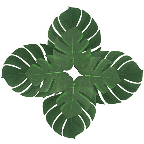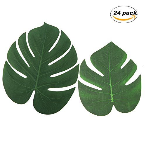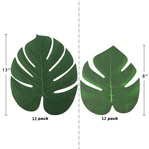 Quantity & Measurement: 24pcs included, Tropical imitation plant leaves are in 2 sizes: 12pcs of large size:13"* 11.3"; 12 pcs of small size:8"*6.9".