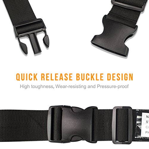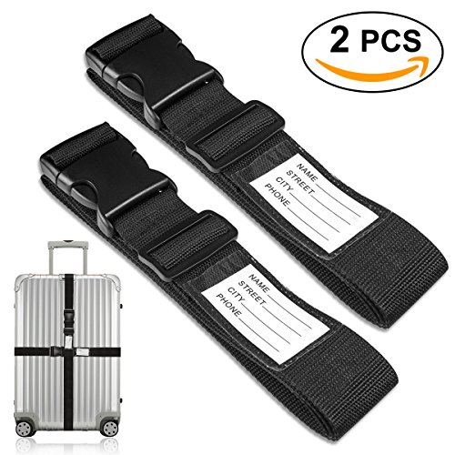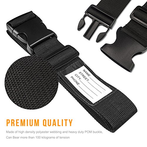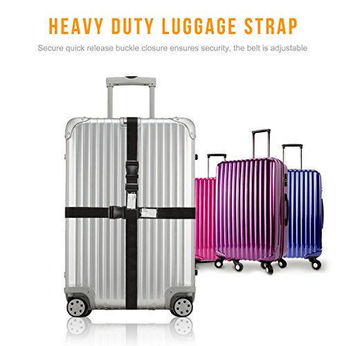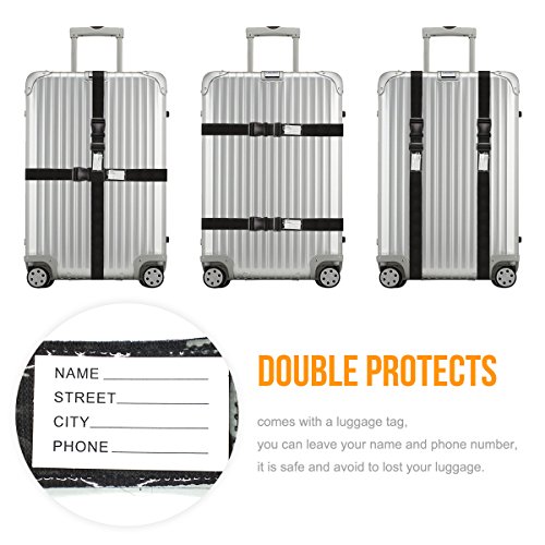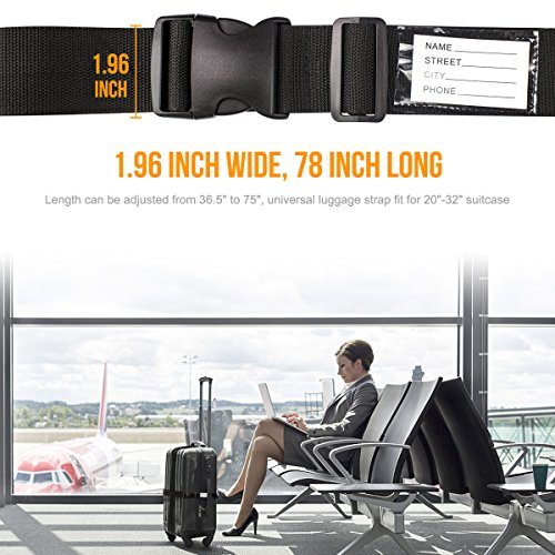 TRAVEL WORRY FREE Quick release buckle closure ensures security Protects your luggage from accidental opening during rough transportation and keeps belongings safe Adjustable Luggage Strap Length can be adjusted from 36.5" to 75", universally fits 20"-32" suitcase Sturdy and Durable Made of high density polyester webbing and heavy duty POM plastic buckle for long-term repeated use Built-in Luggage Tag No need to buy additional luggage tag You can fill in the tag with your address, name and other contact information Helps to identify your luggage and no worry about lost the luggage Your best travel-mate of your luggage for a domestic or overseas trip Specification: Color: Black Material: Polyester webbing plastic buckle Dimension(WXL): 5x200cm/1.96x78inch Package: 2pcs Luggage Straps 0