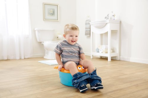 - Feature : Friendly goldfish character makes potty training more inviting / 3-in-1 value, use it as a stepstool after potty training is complete / Features removable legs for easy storage / 3 uses: potty, stepstool and potty ring / Easy-clean bucket