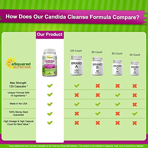 -. Feature : MAXIMUM STRENGTH YEAST INFECTION SUPPORT: Our potent & natural Candida Cleanse helps rid the body of unhealthy Candida and Yeast by starving existing yeast cells, slowing the growth of existing yeast cells, enabling the body to detoxify, and then finally restoring yeast and flora balance. * / 4 PHASE CANDIDA SUPPORT: Our maximum strength treatment formula works to eliminate & clear all Candida in 4 phases: 1) First starving the candida infection 2) Breaking down the membrane of the yeast cells including those deeply embedded in mucosal membranes 3) Gently cleansing and detoxifying the Candida infection from the body 4) Repopulating the stomach and intestines with healthy Yeast and Flora * / BEST VALUE AVAILABLE ON AMAZON - Now!: Backed by our 100% Money Back Guarantee for 30 days, you receive 120 maximum strength capsule pills for a full 60 day supply. With 15 unique ingredients, our potent 1275mg formula delivers more value than the biggest names on Amazon. Our pure Candida Cleanse detox is manufactured in the USA in an FDA registered & GMP certified facility. If you are dissatisfied with our complex you have 30 days to return it for a full refund. * / UNIQUE BLEND OF HERBS, ENZYMES, MUSHROOM EXTRACT, PROBIOTICS & ANTIFUNGALS: With Oregano Leaf Extract for slowing the overgrowth of yeast cells, Caprylic Acid to break down the membrane of the yeast cells including those deeply embedded in mucosal membranes, enzymes Cellulase and Protease to eat away the Candida cell wall and its protein nucleus, L. Acidophilus probiotic strain to help increase and maintain healthy bacteria levels in the intestinal tract, and Black Walnut to prevent yeast. * / STRENGTHENS IMMUNE SYSTEM: Our unique blend includes enzymes to help reduce the "die-off" side effect symp during the candida remove cleansing: Reishi Mushroom, Arabinogalactan and Black Walnut to support the immune system, and probiotics to help increase and maintain healthy bacteria levels in the intestinal tract. Give aSquared Nutrition's products a try such as Colon Cleanse, Thyroid Support, Ceylon Cinnamon (100% All Natural), Turmeric Curcumin, Garcinia Cambogia & Methyl B12! *