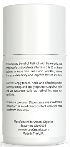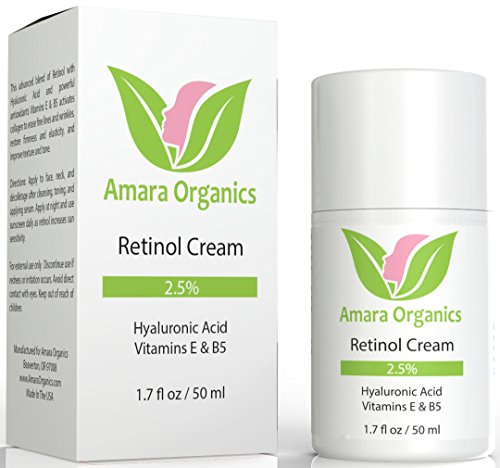 -. Binding : Misc. -. Brand : Amara Organics -. EAN : 0643989690673 -. Feature : #1 DERMATOLOGIST-RECOMMENDED ANTI-AGING INGREDIENT: Retinol is clinically proven to not only work, but continue to work, providing better results the longer you use it. Extensive testing has shown significant improvement in fine lines and wrinkles as well as pigmentation in as little as 12 weeks. Skin continued to improve at the 6, 9, and 12 month marks. / RETINOL = RESULTS: A tried and true age-fighting ingredient that actually works, retinol is by the far the best thing you can do for your skin to combat the signs of aging. Retinol works on a molecular level to repair skin and stimulate collagen, resulting in firmer, smoother, wrinkle-free skin. Speeds up skin cell turnover, fading discoloration and improving texture to give your skin a healthy glow. / ALSO GREAT FOR ACNE & ACNE SCARS: Retinol is an extremely effective acne treatment. It unclogs pores to clear up blemishes, reduce blackheads, and minimize pores. Prevents future breakouts by preventing dead skin cells from clogging pores. Also repairs elastin and stimulates collagen to fade acne scars. / MOST ADVANCED FORMULA AVAILABLE: Our unique blend of 2.5% retinol with moisturizing Hyaluronic Acid, Organic Jojoba Oil and Shea Butter offers superior results with less irritation. Safe for all skin types, including sensitive skin, and can even be used around the eyes. Natural, vegan, and cruelty-free, we use only the best, plant-based ingredients available, with no parabens, no alcohol, and no animal testing. Made in the USA. / WORKS OR YOUR MONEY BACK - Manufacturer's Guarantee: We back our products up with a 365-day hassle-free money back guarantee, no matter where you buy our product. There's absolutely no risk to you when you order now! If you aren't completely satisfied, simply contact us and we'll give you a full refund, no questions asked (you don't even have to return the bottle). Our #1 priority is to make sure our customers are completely happy. -. Label : Amara Organics -. Manufacturer : Amara Organics -. ProductGroup : Beauty -. ProductTypeName : BEAUTY -. Publisher : Amara Organics -. Studio : Amara Organics -. Title : Amara Organics Retinol Cream for Face 2.5% with Hyaluronic Acid & Vitamins E & B5, 1.7 fl. oz -. UPC : 643989690673