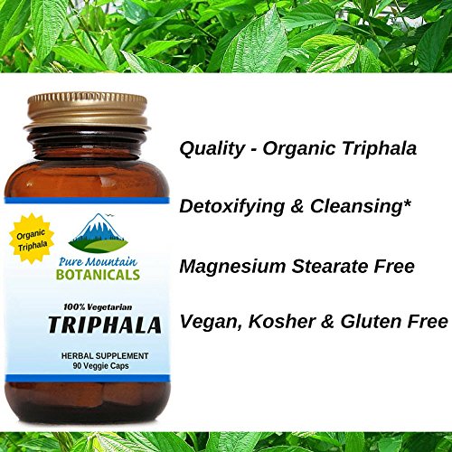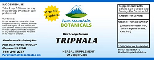 - Feature : Our ORGANIC TRIPHALA contains 500mg of Chebulic myrobalan Fruit, Belleric myrobalan Fruit and Amla Fruit. / DIGESTION SUPPORT: This triphala formula is unique in that the astringent qualities of the fruits promote natural digestive and intestinal cleansing processes. / Our TRIPHALA CAPSULES are VEGETARIAN, KOSHER and GLUTEN FREE. Feel Secure Knowing You're Only Putting the Absolute Best Product in Your Body, Made with NO Harsh Preservatives, Fillers or Flowing Agents - NO Sodium Benzoate, NO Magnesium Stearate, NO GMOs / Triphala is considered to be the most balanced of all herbal compounds, and it is the cornerstone of herbal therapies in India. / 100% MANUFACTURE'S MONEY BACK GUARANTEE - Try the Best - Risk Free! This TRIPHALA CAPSULES and ALL Products from Pure Mountain Botanicals™ are covered by a no-questions asked money back guarantee.