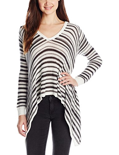 Product DescriptionEasy throw on V-neck sweater with all over stripe and uneven hem.0
