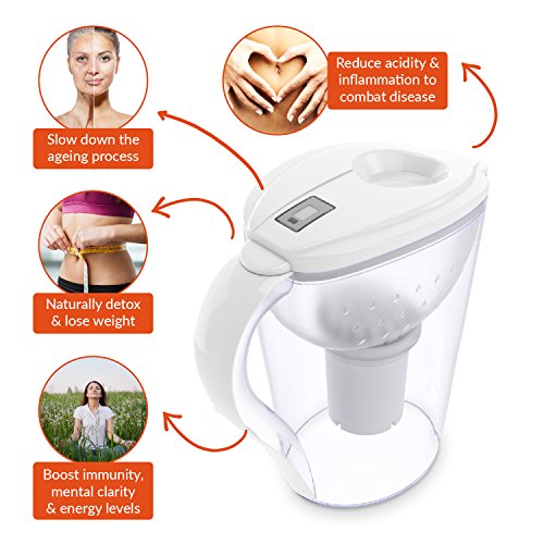 pH RESTORE Alkaline Water Filter Jug With 2 Long-Life Filters is the ultimate ionized filtered water purifier filtration machine. pH RESTORE delivers natural tasting healthy high pH drinking water. Drinking purified alkaline ionized water can improve health by detoxifying your body, through removal of heavy metals such as arsenic, lead, & chemicals including fluoride & chlorine, while increasing essential mineral uptake.