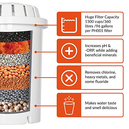 HUGE FILTER CAPACITY = 1500 cups/360 litres/96 gallons per PH001 filter. INCLUDES 2 LONG-LIFE FILTERS SAVING MONEY, & THE PLANET, BY ELIMINATING 8300 PLASTIC BOTTLES PER FILTER. Add our PH002 Ultrafiltration (UF) membrane filter (sold separately, search B01IMRK1ZQ) to take your water purification to the next level. BUY WITH CONFIDENCE - WE OFFER A 100% SATISFACTION MONEY BACK GUARANTEE. Check out our wide range of water products in our Amazon store: https://www.amazon.com/invigorated_water.