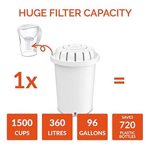 Each filter has a MASSIVE 1500 cup/360 litre capacity Add our PH002 UF Filter to remove 99.9% of bacteria, viruses & colloids.