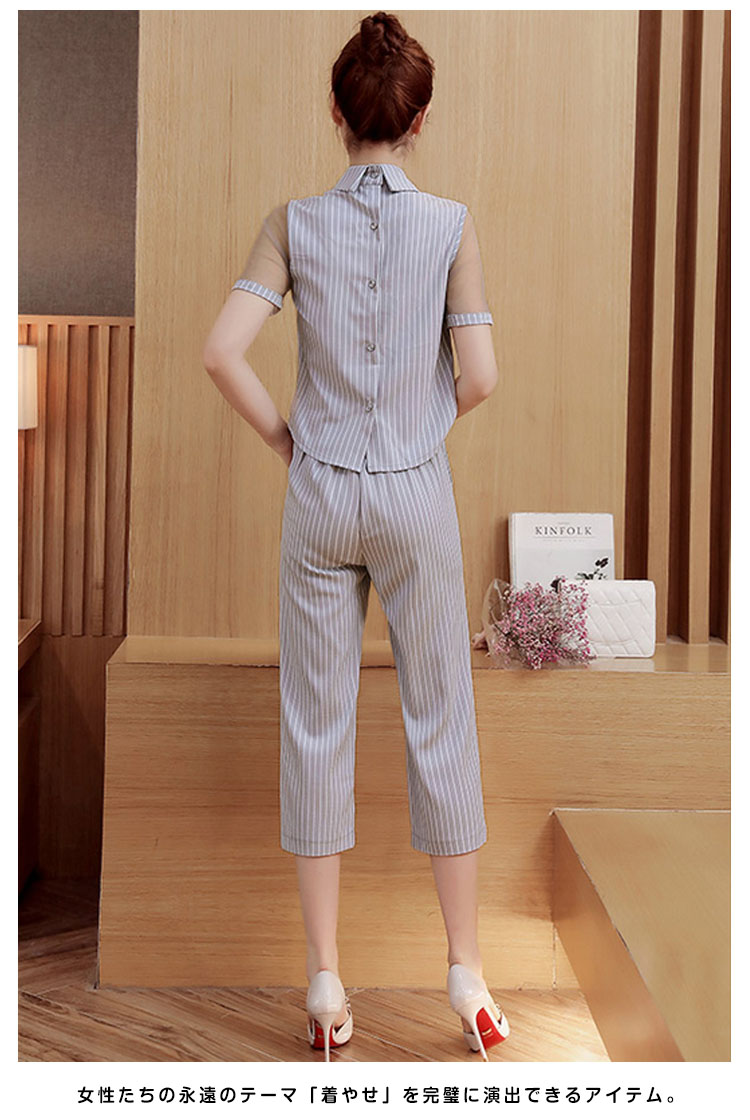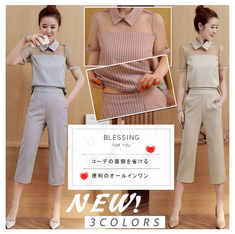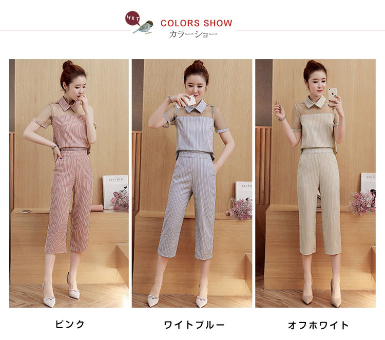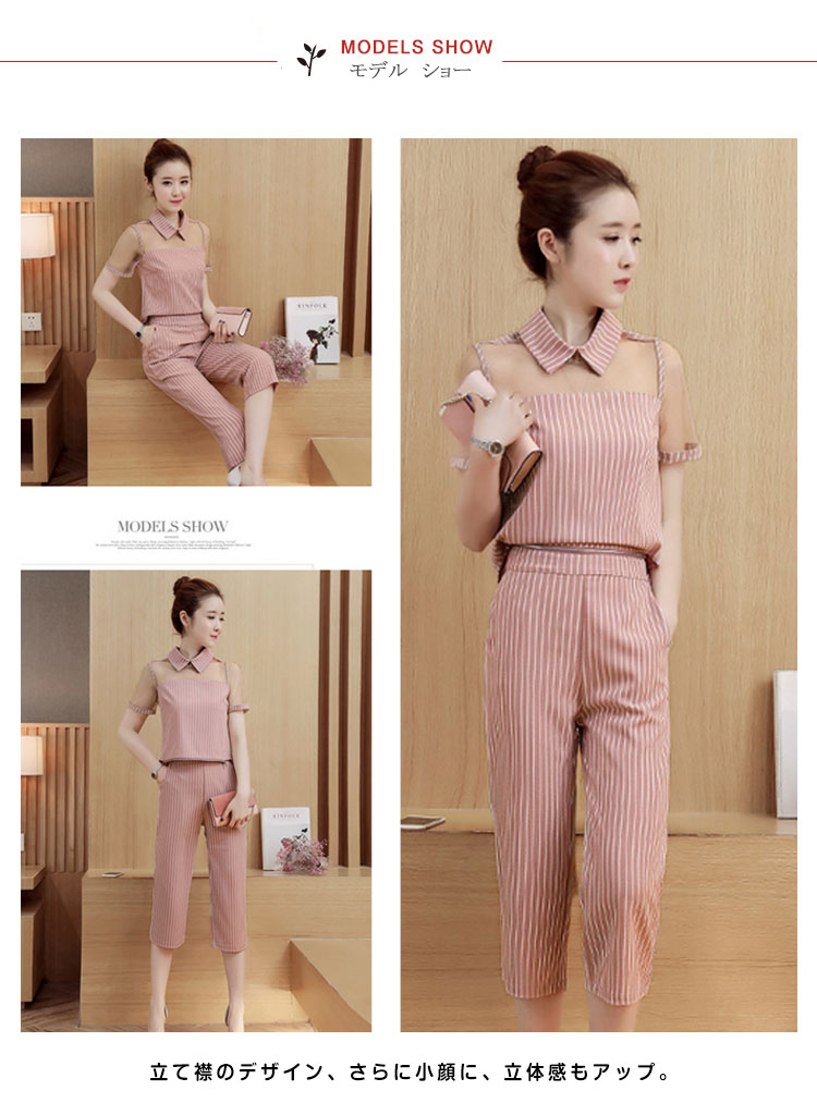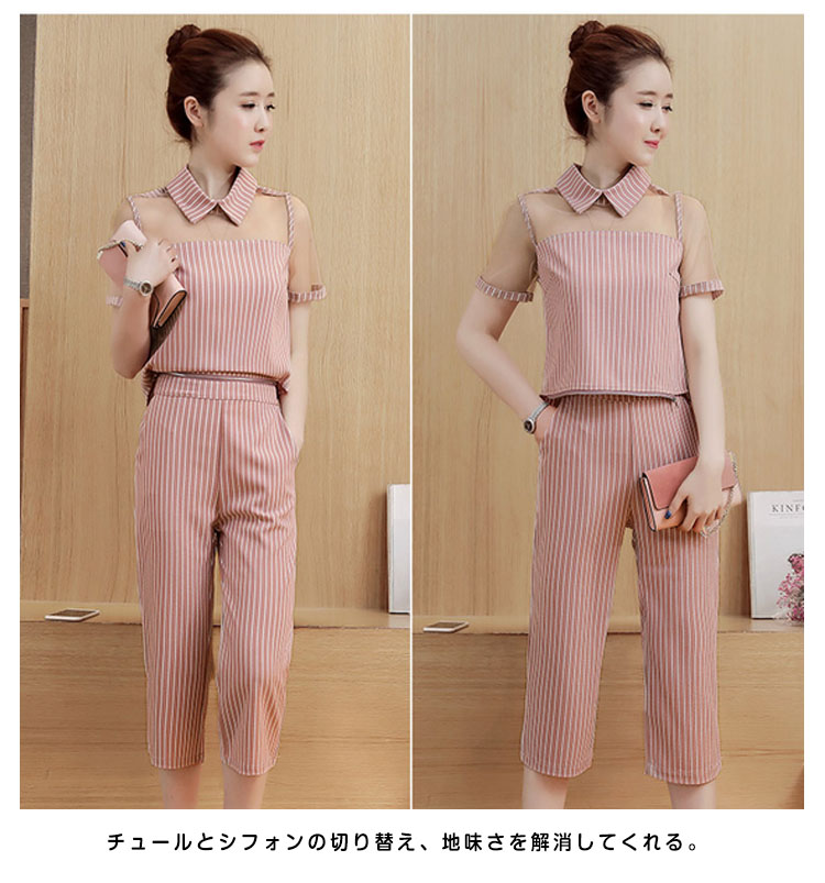 | コーデの面倒を省ける便利のオールインワン。立て襟のデザイン、さらに小顔に、立体感もアップ。チュールとシフォンの切り替え、地味さを解消してくれる。ハイウエスト+ピッタとした9分丈パンツの組み合わせ、着痩せも美脚も際立つ。女性たちの永遠のテーマ「着やせ」を完璧に演出できるアイテム。 | |