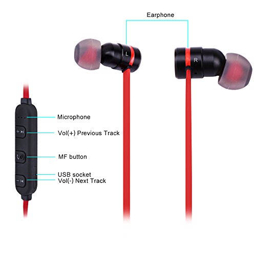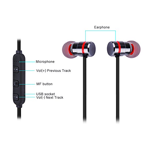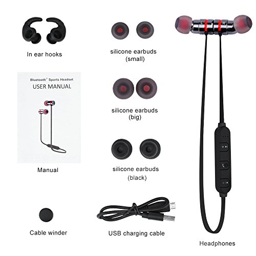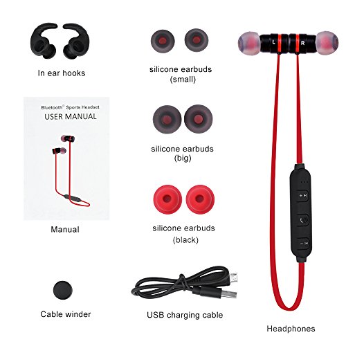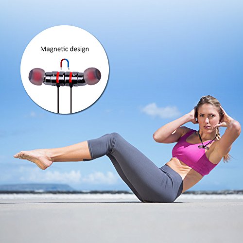-. Feature : Latest Bluetooth 4.1 Technology:V4.1,with CSR8635 chipset.Improved data transfer,fast and easy pairing and a 10-meters working distance,powerful audio driver offers balanced audio and crystal clear sounds / Magnetic Design: Bring it anywhere with you with its cool earbuds magnetic design which you can wear like a necklace. Convenient and ideal for sports,jogging,exercise and other activities / Long Life Battery Capacity:About 5 hours talking,4-5 hours playing time,2 hours charging time, 180 hours standby with a single charge, so you have less time charging and more time doing / Sweatproof Protection:Designed for sport use,sweat at the gym & run in the rain.Ergonomic innovative design ensures this headset is comfortable and secure for running,jogging,Biking,driving,fishing,camping,hiking and other outdoor sports or even relaxing at home / Compatibility: Universal compatible for but not limited to Apple iPhone 6S 6S Plus iPhone 6 6 Plus 5 5S 4 4S iPad iPod Samsung Galaxy S6 S5 S4 S3 LG Motorola Sony and iOS/Android mobile phones. Almost all smartphones can work with this well