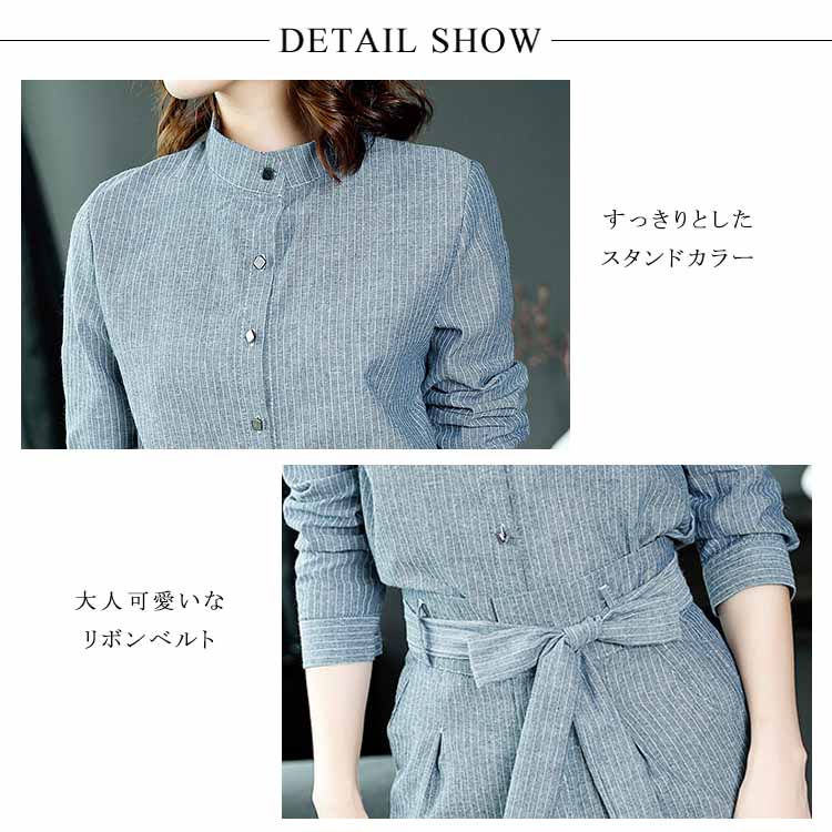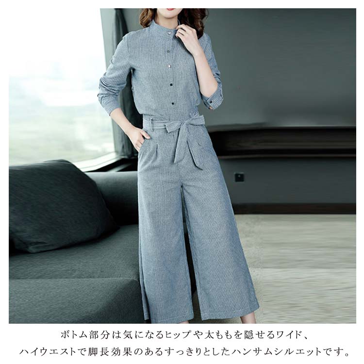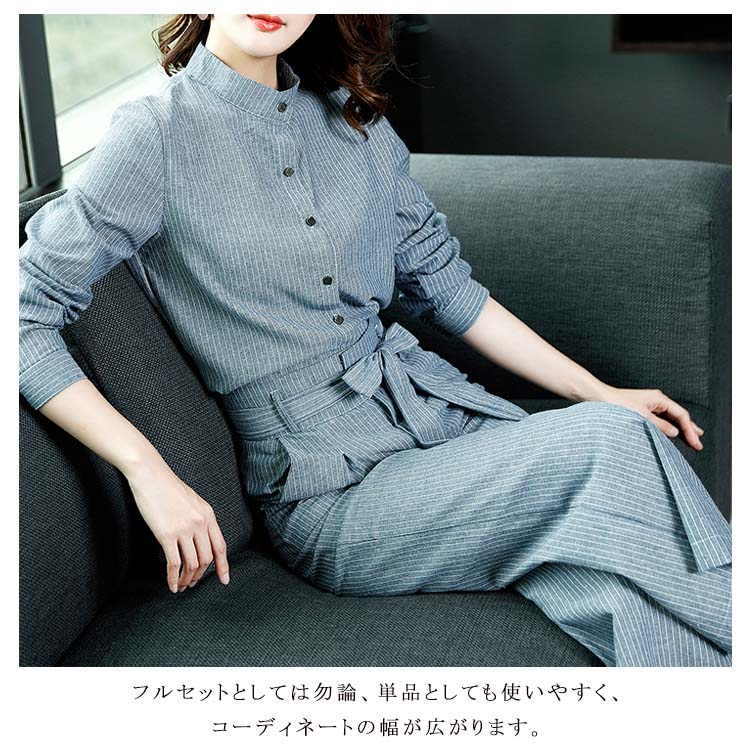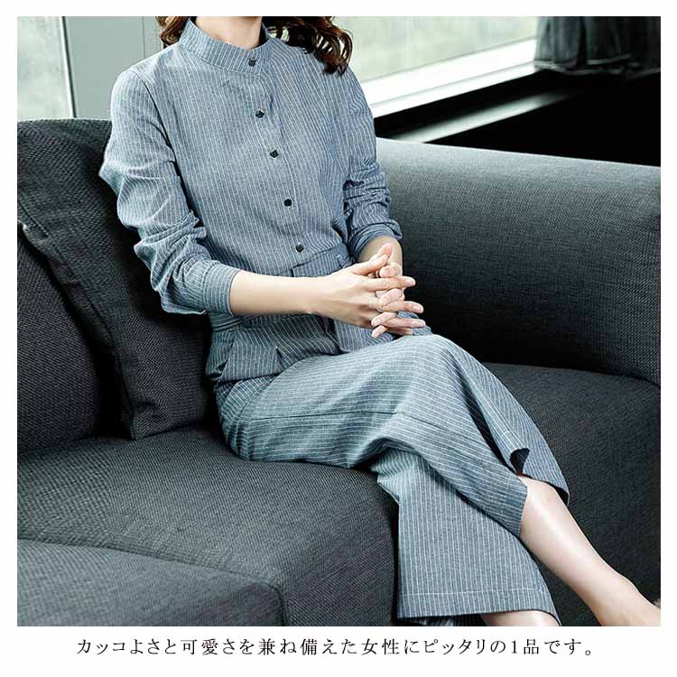 | 女性らしさを演出し、エレガントに見せてくれるストライプセットアップです。ボトム部分は気になるヒップや太ももを隠せるワイド、ハイウエストで脚長効果のあるすっきりとしたハンサムシルエットです。フルセットとしては勿論、単品としても使いやすく、コーディネートの幅が広がります。カッコよさと可愛さを兼ね備えた女性にピッタリの1品です。 | |