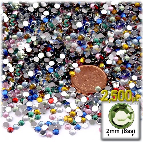 2,500pc Rhinestones crystals Round Shape made of Quality Acrylic sparkling with multi Facetted sides and flat top Multi Colors Assortment - Gems Flat back with Silver Aluminum foil mirror backing size - 2mm about Buy these rhinestones and embellish a variety of crafts projects. You can add these Acrylic facetted rhinestones to many projects Add gemstones to Baby Keepsake items Blitz your nails with rhinestones Highlight your scrapbook memory pages with these colorful jewels Dazzle your picture frames and make unique memories for all around the house with these sparkling gems Rhinestones for holidays are a must, Seasonal crafts Halloween, Christmas Ornaments yearn for these jewels Apply rhinestones to your cloths such as pants shirts or purses Scrapbooking and much more You can stick with glue dots, double sided tape, transfer tape, a dab of tacky glue or low heat glue gun. For more ideas and techniques on how to apply please check our Tips & Tricks section.Feature