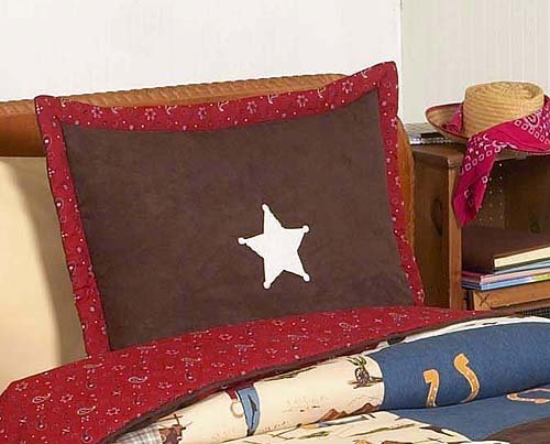 Sweet Jojo Designs Wild West Cowboy 4 pc. Twin Bedding Ensemble has everything you need for your little cowboy. This striking children's bedding set uses a collection of exclusive JoJo Designer Prints. The coordinating fabrics include 100% Cotton JoJo Cowboy Print fabric, Brown and Cream Cow Print, Red Bandanna Print, Plaid, Denim, and Chocolate Micro suede. Detailed with embroidered horseshoes and sheriff stars, this set will create a western theme room that your little cowboy is sure to enjoy.Feature