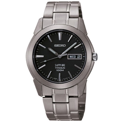 Introducing Seikos Magnificent Titanium Collection. Solid Titanium case (37mm diameter by 8mm thick) and bracelet. Gray dial with luminous silver toned hands and hour markers. Precisely tuned Japanese quartz movement. Day and date display feature. Finely crafted scratch resistant sapphire crystal. Push-Button Deployment type clasp. Water resistant up to 100M.