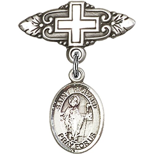 -. Title : Sterling Silver Baby Badge with St. Richard Charm and Badge Pin with Cross 1 X 3/4 inches