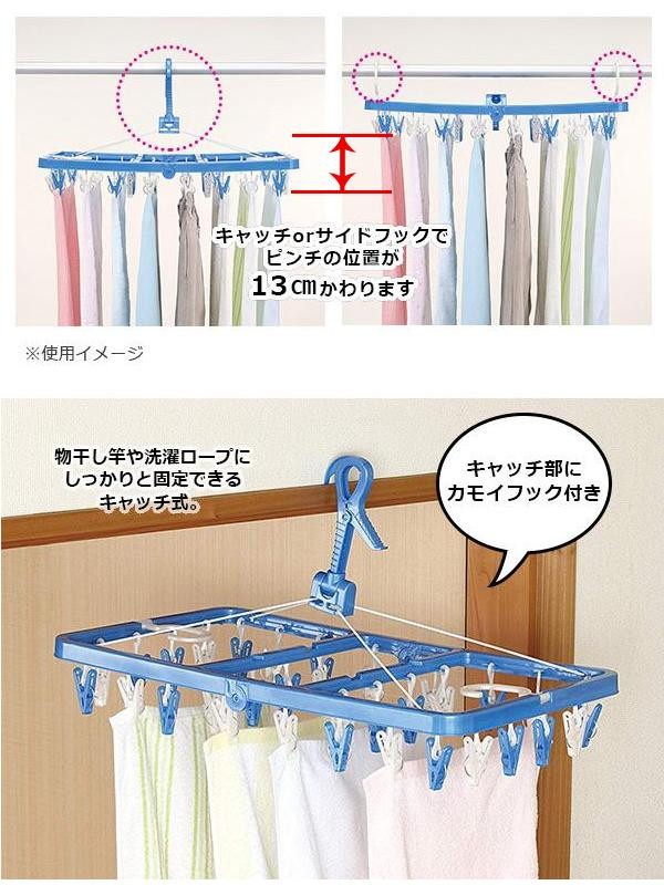 高い竿にはキャッチ干し、ベランダ等の低い竿にはフック干し。洗濯物に跡が残りにくい細かな凸面構造のピンチを使用。傷んだら、お手持ちのピンチと取り替えることができます。急な降雨時などに洗濯物を取り込みやすい下折れ式。 |