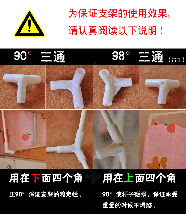 第二:支架的配件是:长4根,宽4根,高4根。98°的三通4个,90°的三通4个。安装的时候,三通的位置很关键。98°是安装上面四个角,90°是安装下面四个角。弄错了会造成不稳定!请一定要看宝贝描述里面的安装说明!