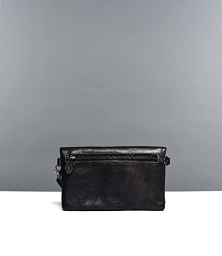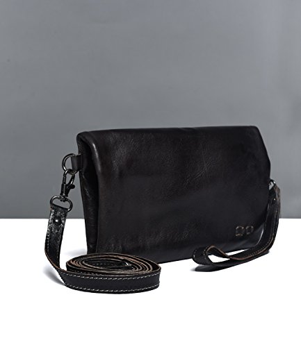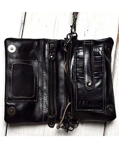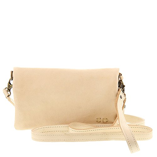 Removable crossbody and wrist straps. Fold-over style with magnetic snap closure . Interior zip pocket and two slip pockets.