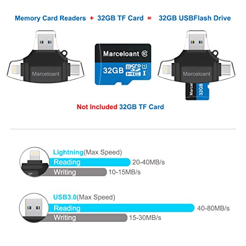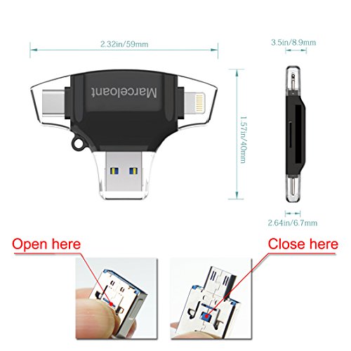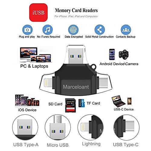 【Multifunction】4 IN 1 Card Reader fit all your devices ,It has 4 interfaces: Lightning connector is for iOS devices; Micro USB connector is for Android devices; USB connector is for computers/Macs;Type-C connector is for Type-C devices.