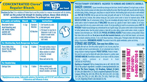 ReleaseDate : 2015-07-16 Studio : Clorox Publisher : Clorox Binding : Grocery Product Description Clorox Regular Bleach keeps laundry and household surfaces white, bright and disinfected. Clorox Regular Bleach makes removing tough stains, such as blood and grass stains, easy and quick. This laundry stain remover can be added to the bleach dispenser or directly to the water after the wash cycle has begun. Clorox Regular Bleach is safe for use on whites only, including white cotton and most synthetic fabrics. It disinfects 99.9% of germs and bacteria and can be used to clean and sanitize toilets, floors, sinks, and other household items. Clorox Regular bleach is great to use for everyday cleaning and seasonal cleaning needs, including Spring Cleaning, Back to School, and Cold and Flu season. The easy to grip handle makes it easy to pour and preventing messy spills. This sodium hypochlorite bleach can be used in both standard and high efficiency washing machines. Clorox Regular Bleach powerfully whitens and disinfects laundry and surfaces. 0