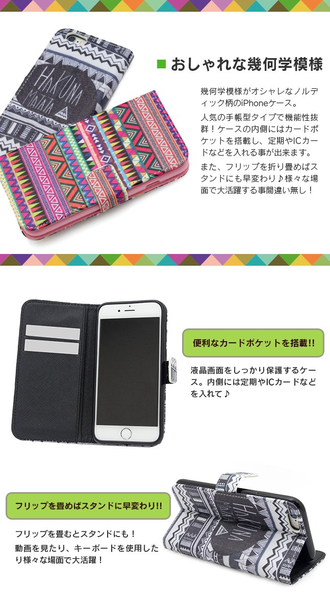 [商品名]ノルディック柄手帳型ケース[仕様]幾何学模様がオシャレなノルディック柄デザインのiPhoneケース。ICカードや定期などが入れられるカードポケット付きケースを折り曲げればスタンドにも早変わり。機能性抜群の手帳型ケースです。[対応機種]iPhone6(4.7インチ),iPhone6 Plus(5.5インチ)[素材]TPU、PUレザー
