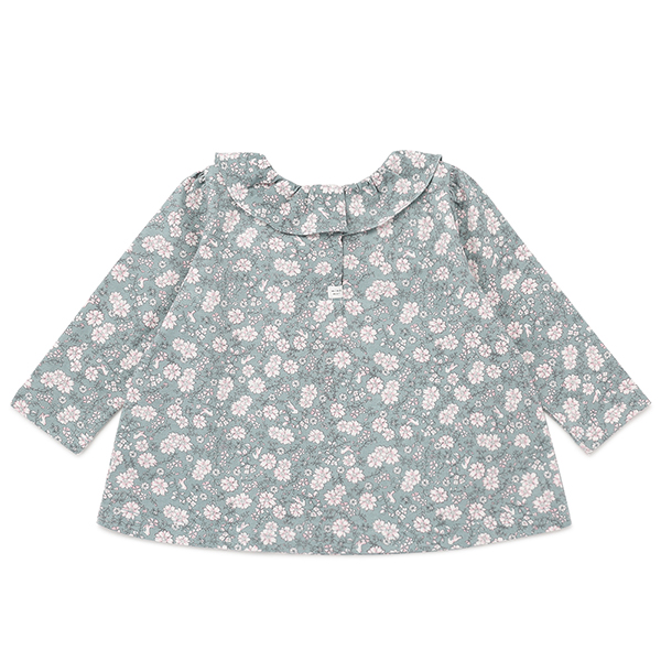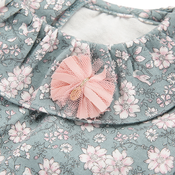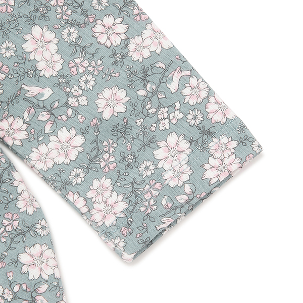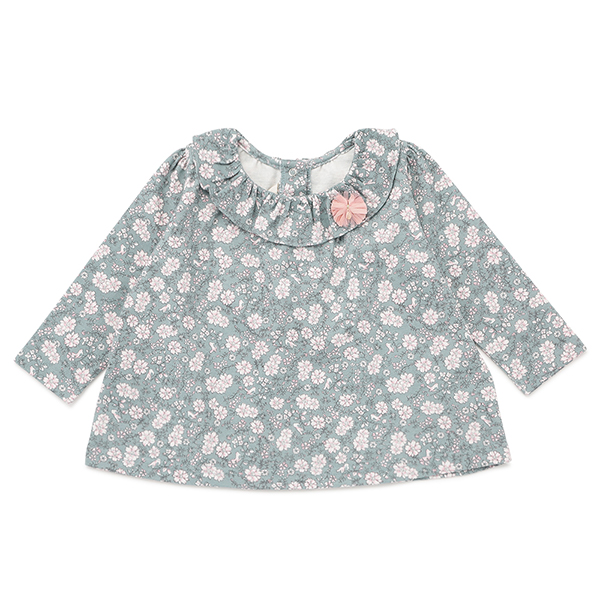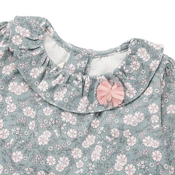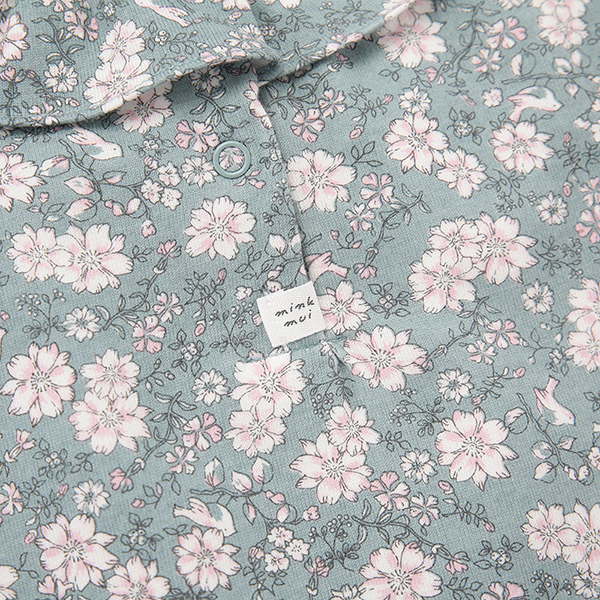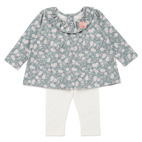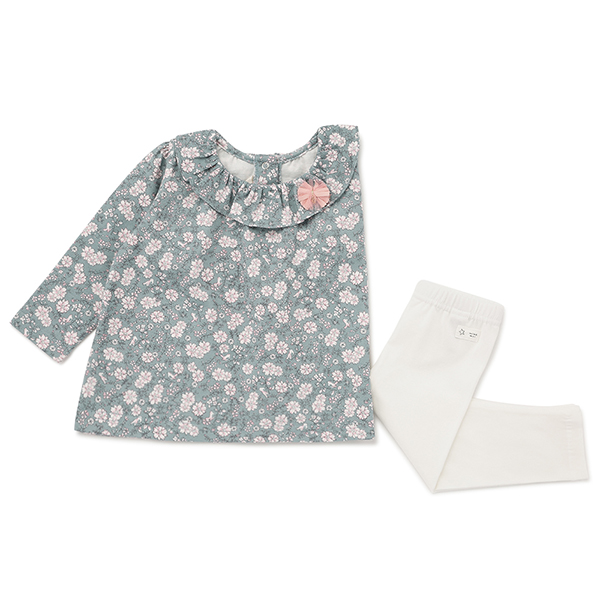 그린컬러에 플라워 패턴이 매치된 사랑스러운 스타일의 상하복입니다.