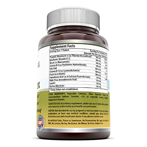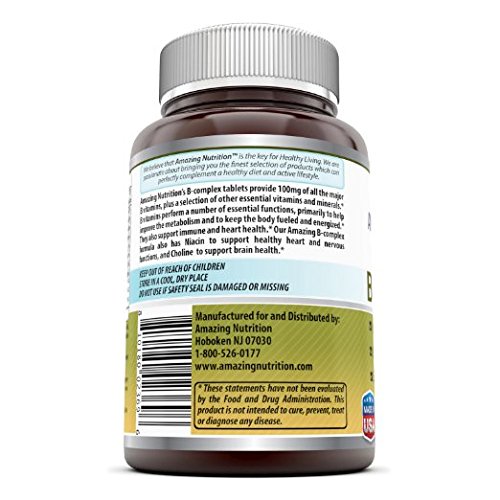 -. Feature : SUPPORT FOR OVERALL HEALTH B vitamins are needed for many bodily functions from metabolizing food to producing energy to keeping the heart and nervous system healthy / ALL NATURAL COMPLETE B COMPLEX You get all of the essential B vitamins with our easy-to-take vitamin B tablets, simplifying good nutrition. Our complex B vitamin is free of artificial preservatives, flavors, dyes and sweeteners. Plus the vitamin B complex 100 tablets contain no sugar, starch, milk, lactose, soy, gluten, wheat, yeast or sodium to fit your diet / BALANCED BLEND Our B complex 100 formulation gives you a total of 100 milligrams or micrograms for balanced nutrition from B complex vitamins / QUALITY YOU CAN TRUST All Amazing Nutrition products are manufactured in accordance with Good Manufacturing Practices (GMP), among the highest standards in the world. / PURITY & POTENCY All our products are proudly made in USA with Guaranteed Purity & Potency. We offer best quality products for the best value. All our products are Third Party Tested. We do not compromise on quality.