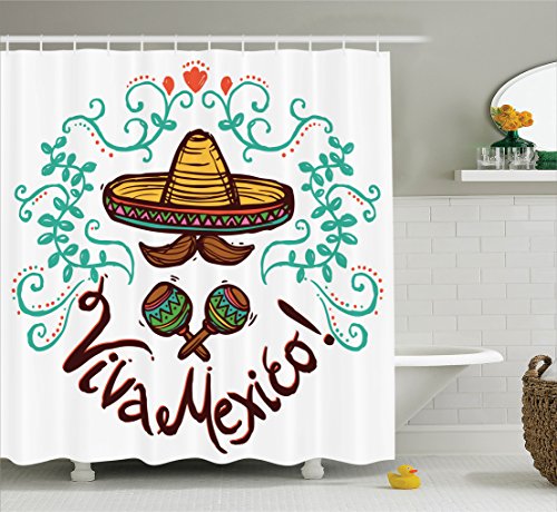 Ambesonne Mexican Decorations Collection, Mexico Style Sketch Floral Ornament Typography Decorating Hispanic Art Print, Polyester Fabric Bathroom Shower Curtain Set with Hooks, Brown Mint Coral
