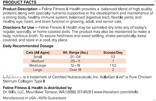 -. Feature : Dr. Bill's Feline Fitness and Health is designed to promote a strong, lean body, healthy immune system, balanced digestive tract, and improved brain function. / Safe for growing and adult cats of all breeds / Using biologically-approP.R.Iate, high-quality, natural ingredients such as Omega-3 Fatty Acids, Feline Enzyme Blend, Bitamin B12, Vitamin D3, Folic Acid, Collagen Teype II, and Hyaluronic Acid. / Used by veterinarians nationwide for over 30 years. / Made in USA