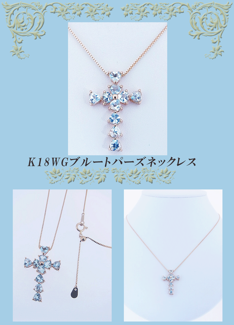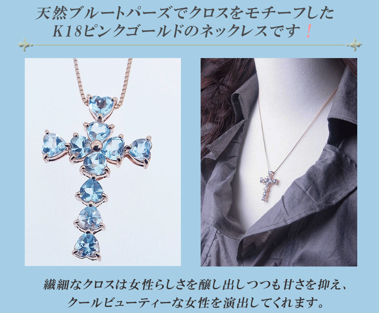 ■商品説明 天然ブルートパーズでクロスをモチーフしたK18ピンクゴールドのクロスネックレスです。