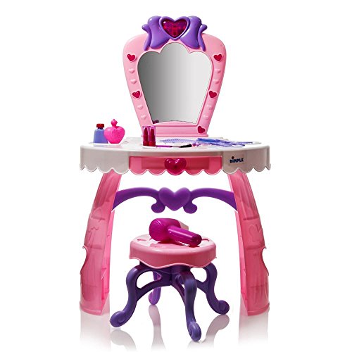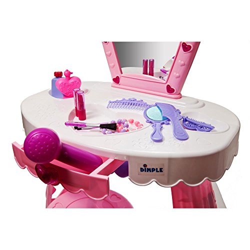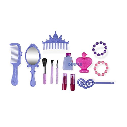 Included in Box1 Vanity Set1 Built-In Princess Mirror1 Built-In Drawer 1 Stool 1 Nail Polish Bottles 2 Lipsticks1 Comb1 Pretend Blow-dryer2 Bracelets1 Tiara1 Perfume Bottle1 Hand Mirror3 Makeup Brushes1 Hair ClipGo-To FunWith this toy you can give them a space to be the king or queens of their room. Make it the focal point of the bedroom or classroom and let it be a fun space for imagination and creative play to flourish!Imaginative PlayImaginative Play is vital for normal child development. This Dimple set will instantly become a favorite of your child with its myriad of uses and fun accessories.Hours of RecreationYour child can be anything for hours! With the wide range of included accessories, the sky’s the limit and guarantees hours of fun! Mess FreeWhile highly realistic, none of the make-up pieces are real or will create a mess, they are all for pretend application and contain nothing that can spill or apply to surfaces and make messes.Feature