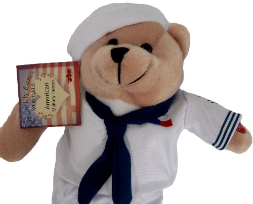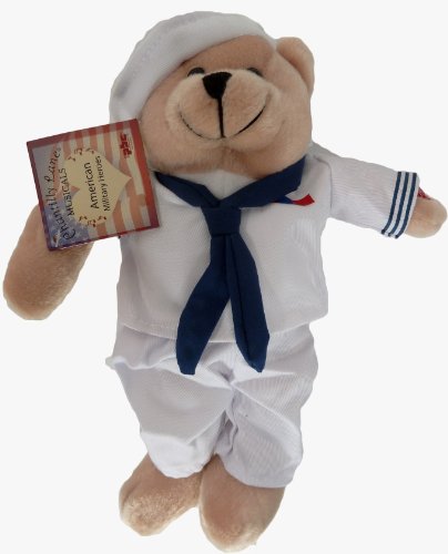-. Binding : Toy -. Brand : Chantilly Lane -. Color : white -. Department : toys -. EAN : 0031635006150 -. Feature : Dressed in traditional sailor "whites" and navy blue necktie and stripes / Squeeze the hand to activate or terminate the singing / Group of sailors sing traditional Anchors Away / 11" X 10" with arms out -. IsAdultProduct : 0 -. Label : Chantilly lane -. Manufacturer : Chantilly lane -. MPN : Anchors Away -. PackageQuantity : 1 -. PartNumber : Anchors Away -. ProductGroup : Toy -. ProductTypeName : TOYS_AND_GAMES -. Publisher : Chantilly lane -. Size : medium -. Studio : Chantilly lane -. Title : Plush Bear Chantilly Lane 11 Inch Singing Military Hero Navy Anchors Away -. UPC : 031635006150