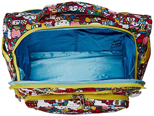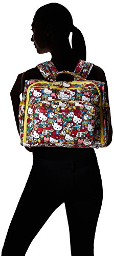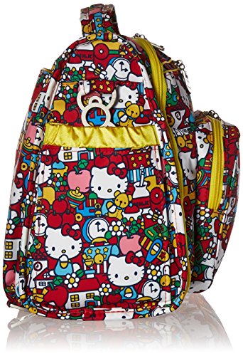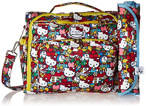 The Ju-Ju-Be Hello Kitty Collection B.F.F. Convertible Diaper Bag provides multiple carrying and storage options to help you stay ultra-organized. Just like your B.F.F., this machine washable backpack is something you cannot live without! Designed with convenience and comfort in mind, this versatile bag can be carried using its top handle, over-the-shoulder strap or backpack straps. The memory foam straps have textured fabric underneath to prevent the bag from slipping off your shoulder. Keep organized and sane, while never sacrificing looking good! The bag's lining is protected with Agion natural antimicrobial treatment, which inhibits and reduces the growth of odor-causing bacteria, mold and mildew. The outer fabric is treated with Teflon fabric protector, so you can repel stains and keep it clean. The front "mommy" zippered pocket is large enough for smartphones, wallets, keys attach to the key fob stretch cord, and other personal items. Inside organization includes (4) gusseted pockets, (3) zippered pockets and lots of wide open space! The main zippered pocket is large enough for diapers, wipes, extra clothes and other items. The back pocket is designed with crumb drains to keep this area clean, is large enough to store your child's books, and includs a super cushy matching memory foam changing pad. Bottle pockets are located on either side of the bag and come insulated with Thinsulate by 3M to keep your items hot or cold. The Tick Tock print is a multicolored, whimsical Hello Kitty pattern. The print is accented by silver colored hardware, including luggage feet to keep the bottom of your bag clean when you set it down. With the B.F.F. Diaper Bag, you can choose to wear it as a backpack or messenger style - it’s your choice. Whichever you choose, the B.F.F. has your back, just like every B.F.F. should! The Ju-Ju-Be Hello Kitty Collection B.F.F. Convertible Diaper Bag comes with a 90-day limited warranty that protects against manufacturing defects.Feature