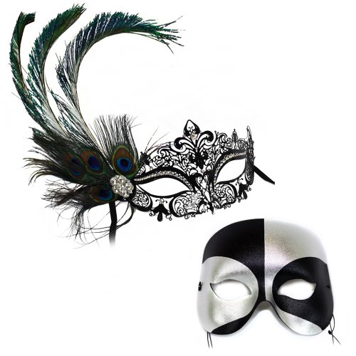 We have chosen two complimentary masks from our collection to make a "COUPLE". The price is for two masks. Simone with peacock feathers is a laser cut metal lacy luxury masquerade mask sprinkled with rhinestones and accented with a rhinestone brooch. It secures with ribbons. The matching mask is a Black and Silver Masquerade mask. It secures with an elastic band. Our own original design hand decorated in the USA by our talented artists.Feature