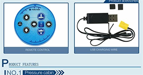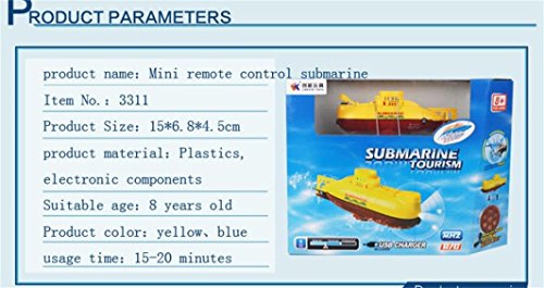 Studio : Dacawin Publisher : Dacawin Binding : Office Product Product Description Feature: Speed: 0.1m/s Battery for submarine: 3.7V 120mAh Li-po Battery for transmitter:6x 1.5V AAA (Not included) Certificate:EN71/EN62115/EMC/RTTE/RoHS/7P Function: Forward, Backward, turn left and right 27/40MHz radio control racing submarine ship for kids Suspending at a specific water depth 360°rotation at specific depths Straight line diving navigation With a remote waterproof transmitter Exercise your kid's mental ability and physical coordination Built-in rechargeable battery, USB charging cable included.