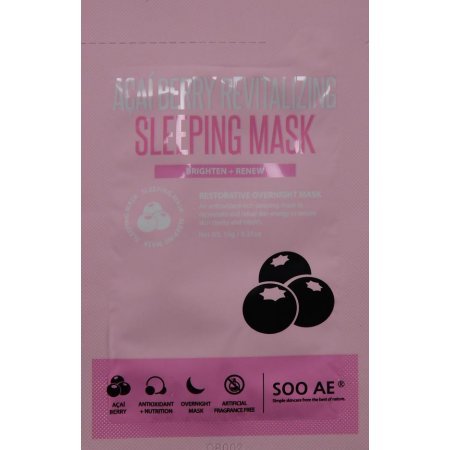 Studio : Soo Ae Publisher : Soo Ae Binding : Health and Beauty Product Description Give your skin the tender loving care it needs with the Soo Ae Sleeping Mask. This product is specially formulated with nutrients to deliver excellent revitalization and nutritional benefits to dull, lackluster and fatigued skin. This overnight solution has a silky, lightweight and non-sticky formula that's easy to apply. This acai berry sleeping mask contains blueberry extract and niacinamide to restore skin clarity, health and elasticity. The result is moisture-plumped, luminous and glowing skin. Sage leaf, peppermint leaf and lavender extracts provide additional benefits to soothe, calm and relax skin. This unique revitalizing mask contains sorbitol and 12 plant extracts. It comes in a 0.35 oz pouch. 0