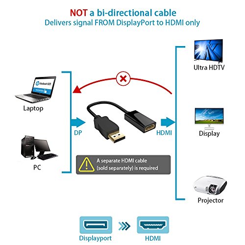 Studio : QICENT Publisher : QICENT Binding : Electronics Product Description Description Connect your PC equipped with displayport?to a 4K HDMI video display using this DisplayPort to 4K HDMI Adapter from QICENT! Ideal for entertainment rooms, home office or conference rooms andr anyone engaged in high level computing, gaming and graphics. ? Brief introduction: Connects laptop to HDMI-enabled monitor or HDTV Transmits video in high-definition up to 4K resolution Plug and play for seamless connection to external displays Reliable connection Compact and lightweight design Requires separate DVI cable ? Specifications: Input: DisplayPort Output: HDMI Length: 15cm / 0.5ft Supports resolution up to 4K (3840x2160) ? Note: 1.Can only convert signal from DisplayPort to HDMI. This is not a bi-directional adapter 2.HDMI cable not included ? What You Will Receive 1 x Mini DisplayPort to HDMI 4K Adapter ? ?Manufacturer Warranty - 18 Months warranty and lifetime technical support. We have tested every product before package, please?kindly email us first if any problems, we will offer you best service and the best solution, thank you so much! ? 0