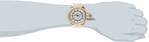 Silver dial with metallic blue hands and black Roman numerals; Luminous; 18K gold plated stainless steel bezel; Crown with screw-down protective cap and security chain; GMT