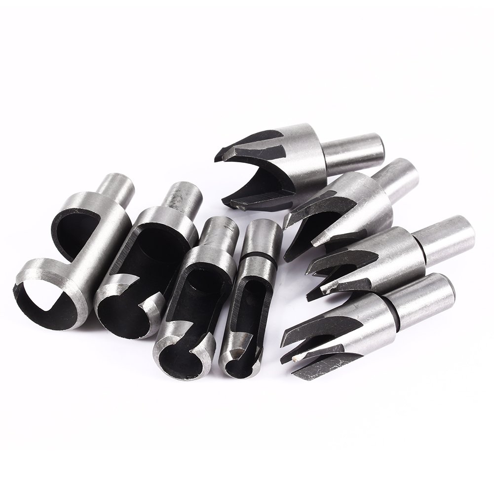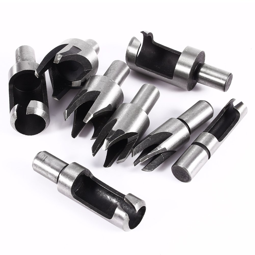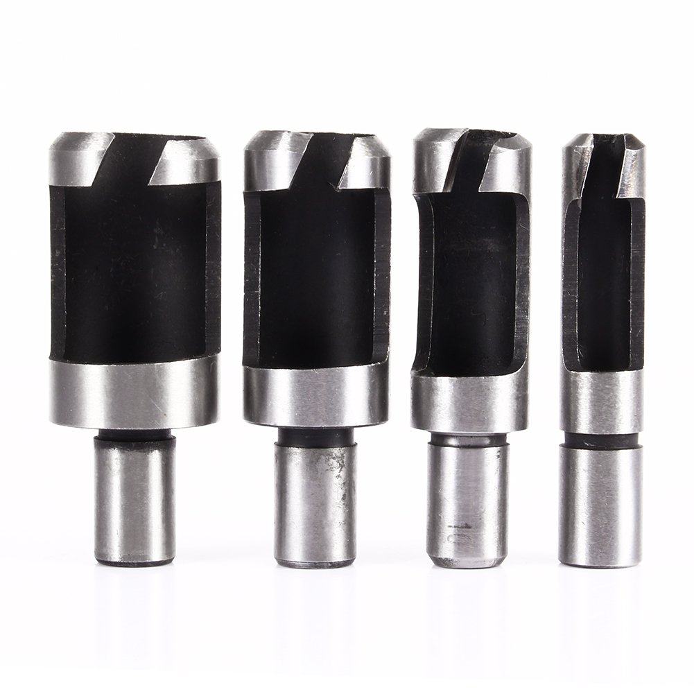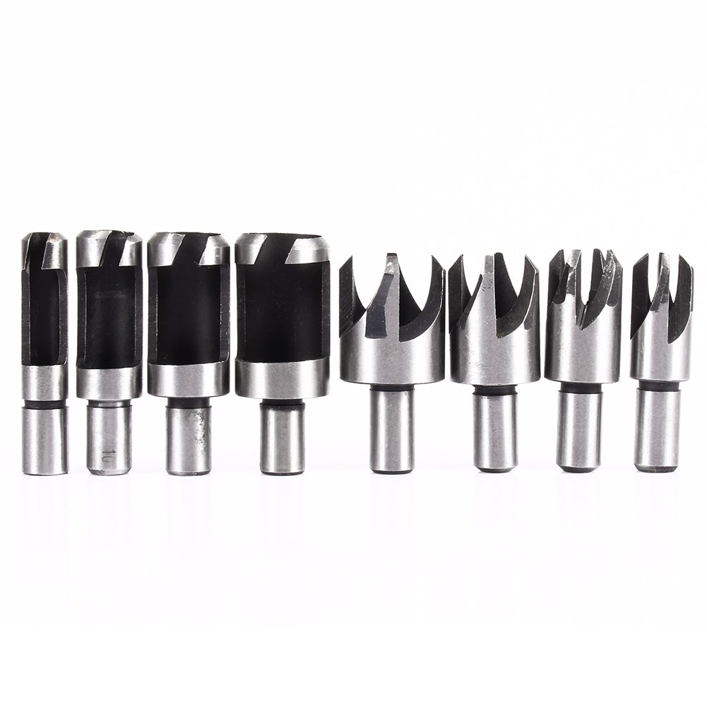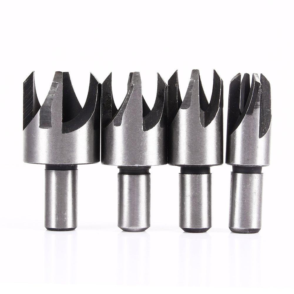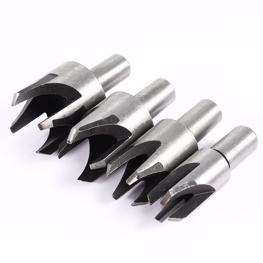 This plug cutter set consists of four standard plug cutters and four four-tooth chamfer cutters.