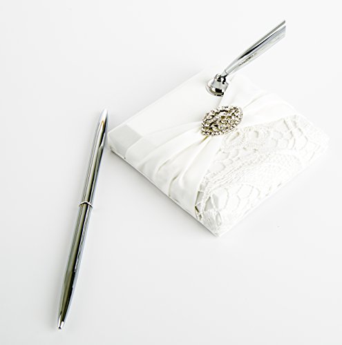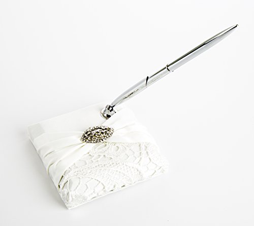 PEN SET: Our pen set is designer to perfectly match the guest book. The base is cream satin and features off-white lace, a cream-colored sash, and a silver rhinestone broach. The sleek silver pen is mounted on a swiveling base and writes in black ink.