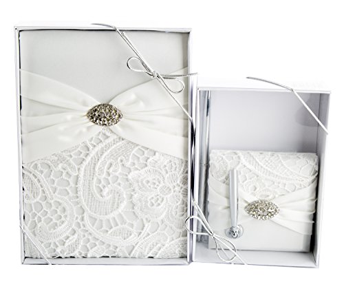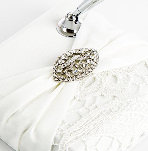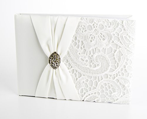 GUEST BOOK: Our elegant cream lace guest book is beautifully crafted for an antique look. The cover is decorated with off-white lace, a cream satin sash, and a rhinestone broach. Subtle details like the paisley knit of the lace and intricate design of the broach accent make for a timeless look.