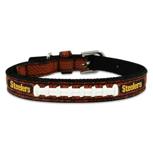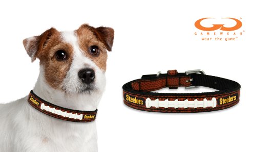 -. Binding : Misc. -. Brand : GameWear -. Feature : Officially licensed NFL dog collar / Made from handcrafted football leather and laces / Durable stitching / Emblazoned with your favorite NFL team / Hard-wearing metal buckles and grommets -. Label : GAME WEAR INC -. Manufacturer : GAME WEAR INC -. PackageQuantity : 1 -. ProductGroup : Pet Products -. ProductTypeName : PET_SUPPLIES -. Publisher : GAME WEAR INC -. Studio : GAME WEAR INC -. Title : NFL Pittsburgh Steelers Leather Dog Collar