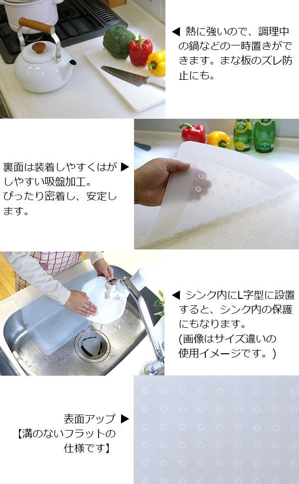 キッチンカウンターを汚れや食器キズから保護する便利なマットです。半透明なので人工大理石やタイルキッチンカウンターの高級感ある雰囲気を壊しません。調理中の熱い鍋やフライパンなどを置いても大丈夫。ズレやすいまな板も安定します。また、シンク内にL字型(側面・底面)で吸盤を固定していただくと、シンク内の保護にもなります!! |