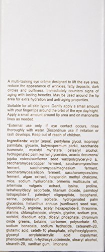 A multi-tasking eye crème designed to lift the eye area, reduce the appearance of wrinkles, fatty deposits, dark circles and puffiness. Counters signs of aging immediately with lasting benefits. Lightweight texture absorbs easily while hydrating, soothing and protecting the delicate eye area. Reduces fine lines and wrinkles (immediate and long term peptide, amino acid). Minimizes under eye circles, bags and puffiness (prolines, red algae, cucumber). Stimulates collagen production and defends against elastin breakdown (vitamin c, amino acids). Lifting (gingko biloba, peptide complexes, prolines) and balanced hydration (balanced moisture magnet, squalane, algae).Feature
