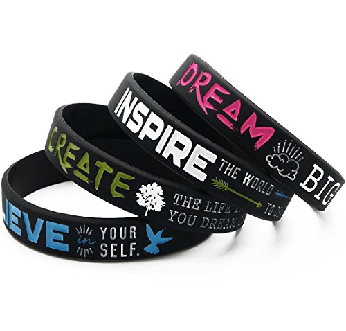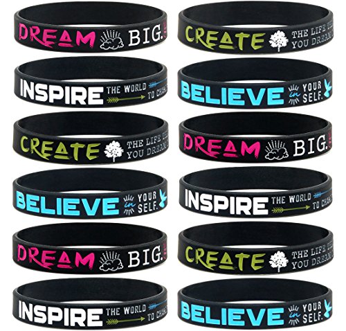(12-pack) "Dream, Believe, Inspire, Create" Silicone Wristbands - Wholesale Bulk Pack of Inspirational Message Bracelets