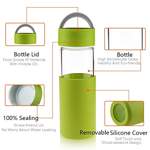 -. Feature : 15 Ounce Glass Water Bottle is Manufactured from BPA Free and Eco-friendly, Borosilicate Glass for Easy Cleaning and Safe Reuse. The Cap is Made of BPA-free Polypropylene Plastic. / Our Glass is Heat Resistant. The Temperature Range that the Water Bottle can Withstand is -30 degrees Celsius to 240 degrees Celsius (-22 degrees to 464 degrees Fahrenheit). Please Enjoy Hot Tea or Coffee,Cold Beverages as well. / The Mouth Diameter is 1.97 inches. The Lid is Easy to Twist on/off and 100% Leak-proof. Also Food-grade Super Durable Non Slip Silicone Sleeve Offers Secure Grip and Protects Bottle against Breakage. / With the Portable Size of approximately 8.07 inches High with Cap and 2.75 inches in Circumference,Light Weight of 0.88 Pounds, It is Convenient for Carrying with Ring Handle Wherever you Go. It is Great for Outdoor Relax, Sports & Travel. / 6 Colors Available. Please choose your favourite Color. Please Enjoy the Shopping in Reeho Store without any Hesitate. Reeho offer LIFETIME REFUND or REPLACEMENT GUARANTEE. -- Wander in Green Life!!
